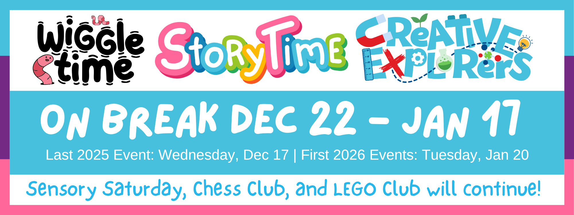Storytime is offered continually, with breaks occurring in late December and August. Join us for fun, stories, songs, puppet shows, and a craft to take home!